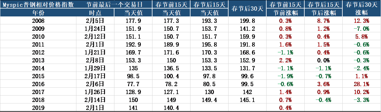 具體價(jià)格方面,從往年Myspic普鋼先對(duì)價(jià)格指數(shù)的春節(jié)前后對(duì)比來(lái)看,最近十年有70%的概率節(jié)日前后15日價(jià)格漲跌趨勢(shì)一致。2019年春節(jié)前15日鋼價(jià)指數(shù)累計(jì)小幅上漲0.4%,預(yù)計(jì)開門紅行情大概率出現(xiàn)。