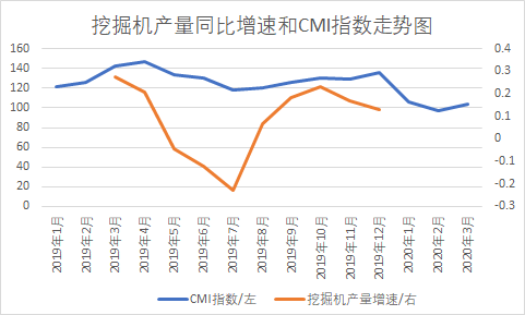 對比挖掘機產量各月同比增速和CMI走勢來看,挖掘機產量同比增速和CMI指數走勢基本保持一致。2020年3月CMI指數環(huán)比有所回升,預計2020年3月挖掘機產量同比增速也將有所提高。