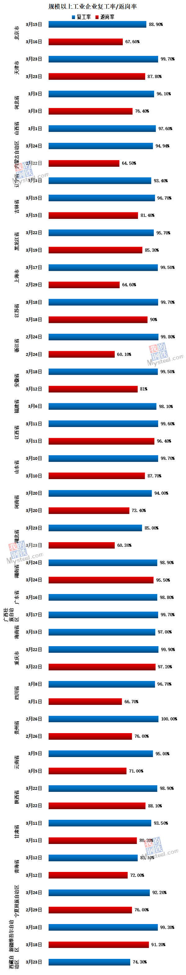 Mysteel統(tǒng)計數據顯示,截至3月26日,27省市規(guī)模以上工業(yè)企業(yè)復工率超過90%,江蘇、江西、湖南、重慶、新疆等省份人員返崗率超過90%。各地重大項目也陸續(xù)開工。